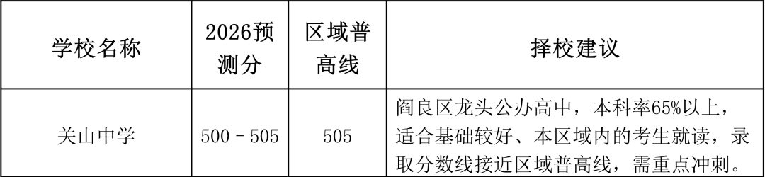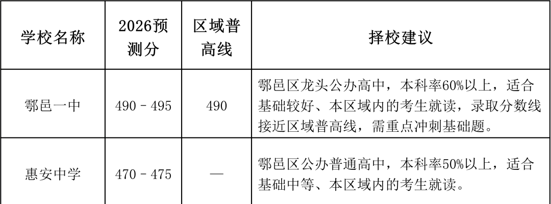 【参考借鉴】该梯队高中是“稳妥普高路线”的核心选择,考生的核心目标是“过线录取”,备考重点放在基础题上,确保基础题零失误,中档题尽量多拿分,难题可放弃,避免因追求难题丢分,导致总分不够普高线。同时,志愿填报时可优先选择本区域内的学校,提高录取概率。